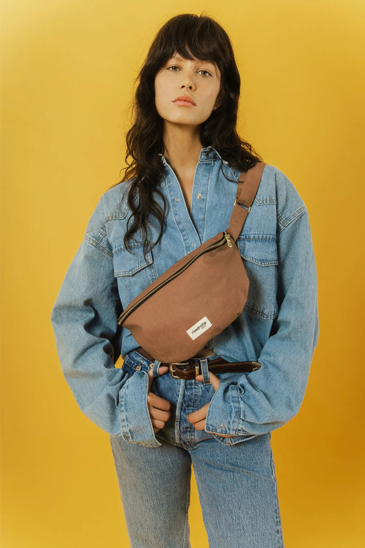 Le sac banane Custine en couleur noisette (Hazelnut) utilise les mêmes matières responsables : coton recyclé ciré, finition déperlante. Une teinte douce et neutre qui s’intègre à tous les univers.