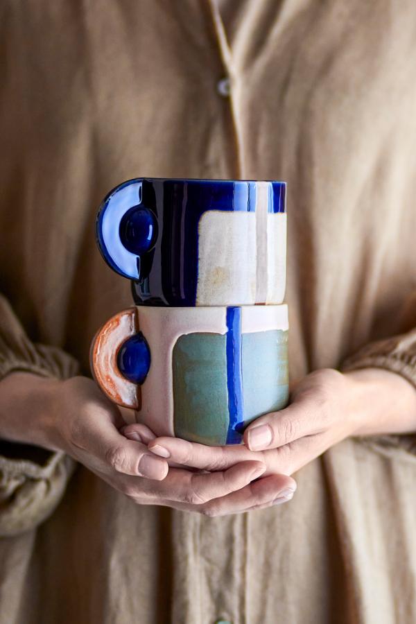 Les tasses Bolivia multicolores en grès sont proposées en lot de deux et se distinguent par leur émail réactif et leurs motifs peints à la main, rendant chaque pièce unique. Avec une contenance confortable, elles sont idéales pour déguster vos boissons chaudes quotidiennes ou pour offrir une pause café colorée. Leur style joyeux et original apporte une touche artistique à votre vaisselle.
