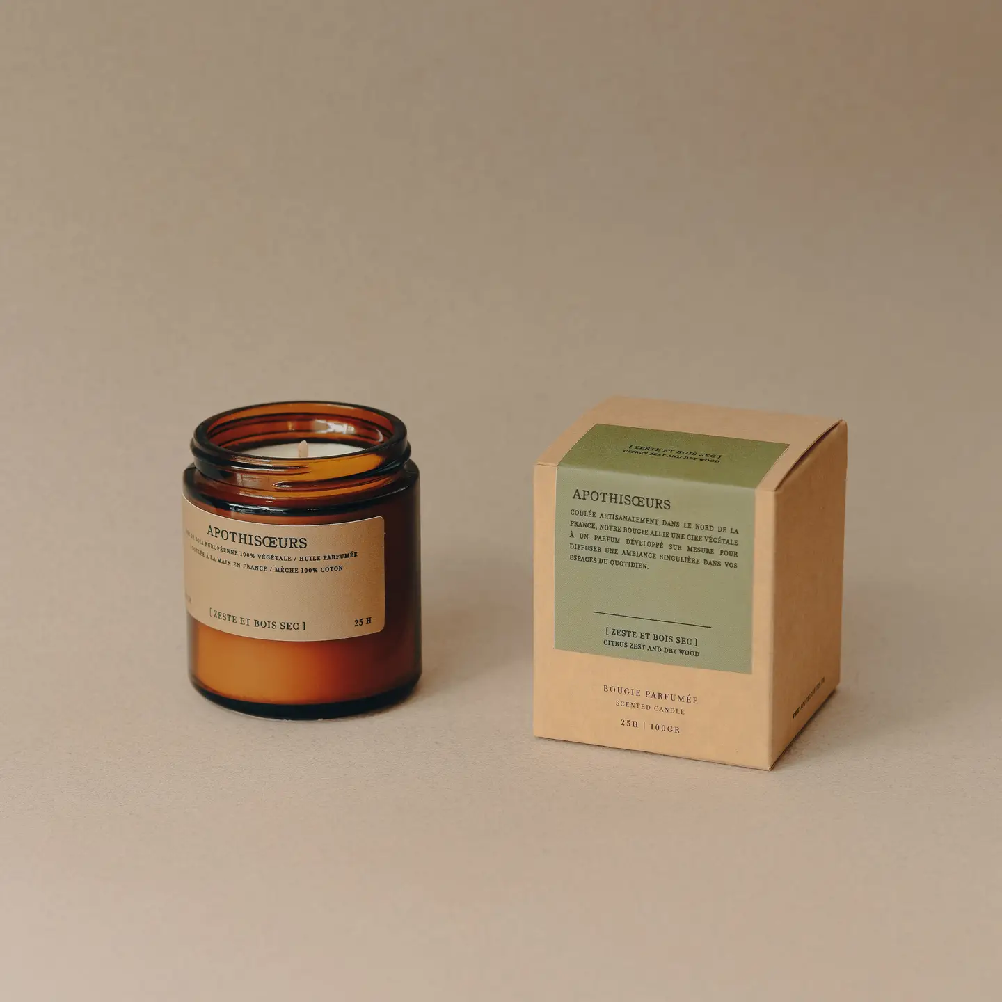 La bougie « Zest & Dry Wood » de notre sélection est coulée à la main dans un atelier français. Elle est conçue avec une cire 100 % végétale certifiée ÉCOCERT, accompagnée d’une mèche en coton certifiée OEKO‑TEX.