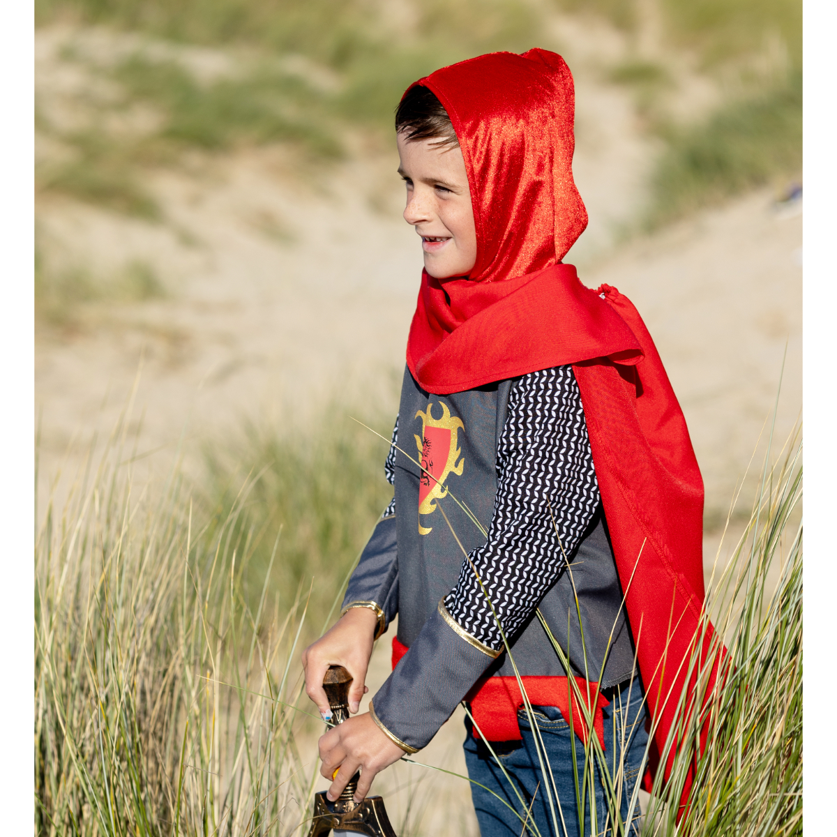 Déguisement Chevalier Perceval inspiré des héros médiévaux, avec tunique ornée d’écusson, ceinture et cape pour une allure chevaleresque. Confortable et facile à enfiler, ce costume transforme chaque enfant en noble défenseur du royaume.