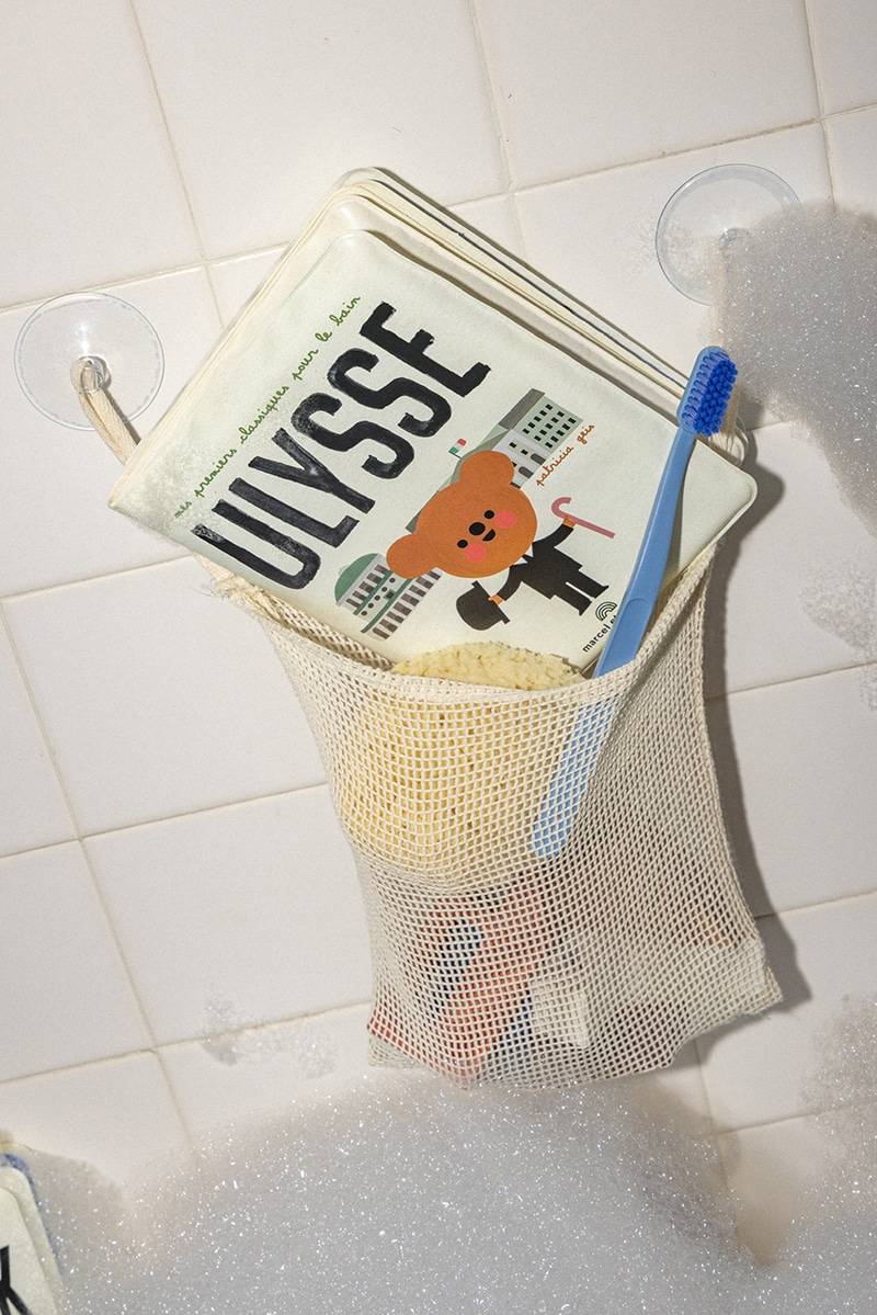 Ulysse est un adorable livre de bain pensé pour accompagner bébé dès la naissance. Avec ses illustrations douces et colorées, il transforme le moment du bain en une expérience ludique et rassurante. Livré avec un filet de rangement à ventouses pour un séchage facile.