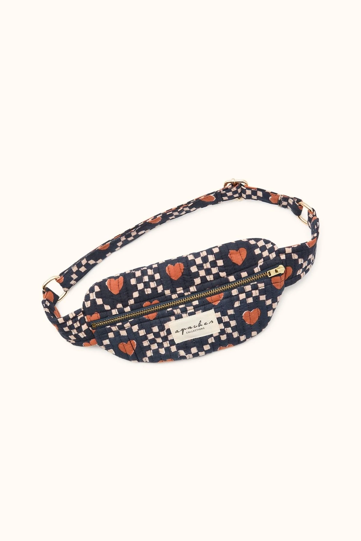 Le mini sac banane de la marque APACHES en coton matelassé séduit par son imprimé cœur tendre et graphique. Compact et fonctionnel, il permet de transporter les essentiels en toute simplicité. Mixte et plein de style, il apporte une touche romantique et pratique à toutes les aventures ! Retrouvez la marque APACHES chez Bonnie Bonnie !