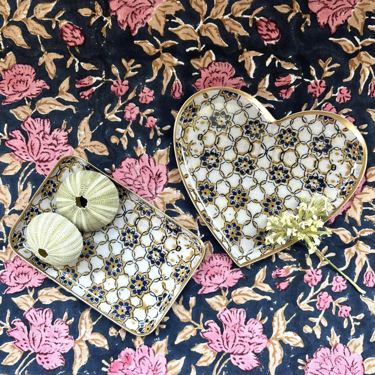 Apportez une note élégante et méditerranéenne à votre intérieur avec ce plateau en métal émaillé motif zellige bleu. Sa bordure dorée peinte à la main et son verso doré lui offrent une allure raffinée, parfaite pour le service ou la décoration.