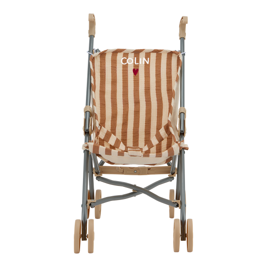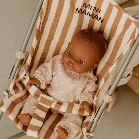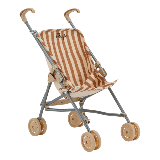 Offrez à l’enfant un accessoire de jeu élégant avec cette poussette canne pour poupée de la marque Atelier Wagram. L’assise est conçue en gaze de coton haut de gamme à motif «rayures larges», combinant douceur textile et style graphique. La structure métallique et plastique se plie facilement, pour un rangement simplifié et un usage adapté aux enfants dès 3 ans.
