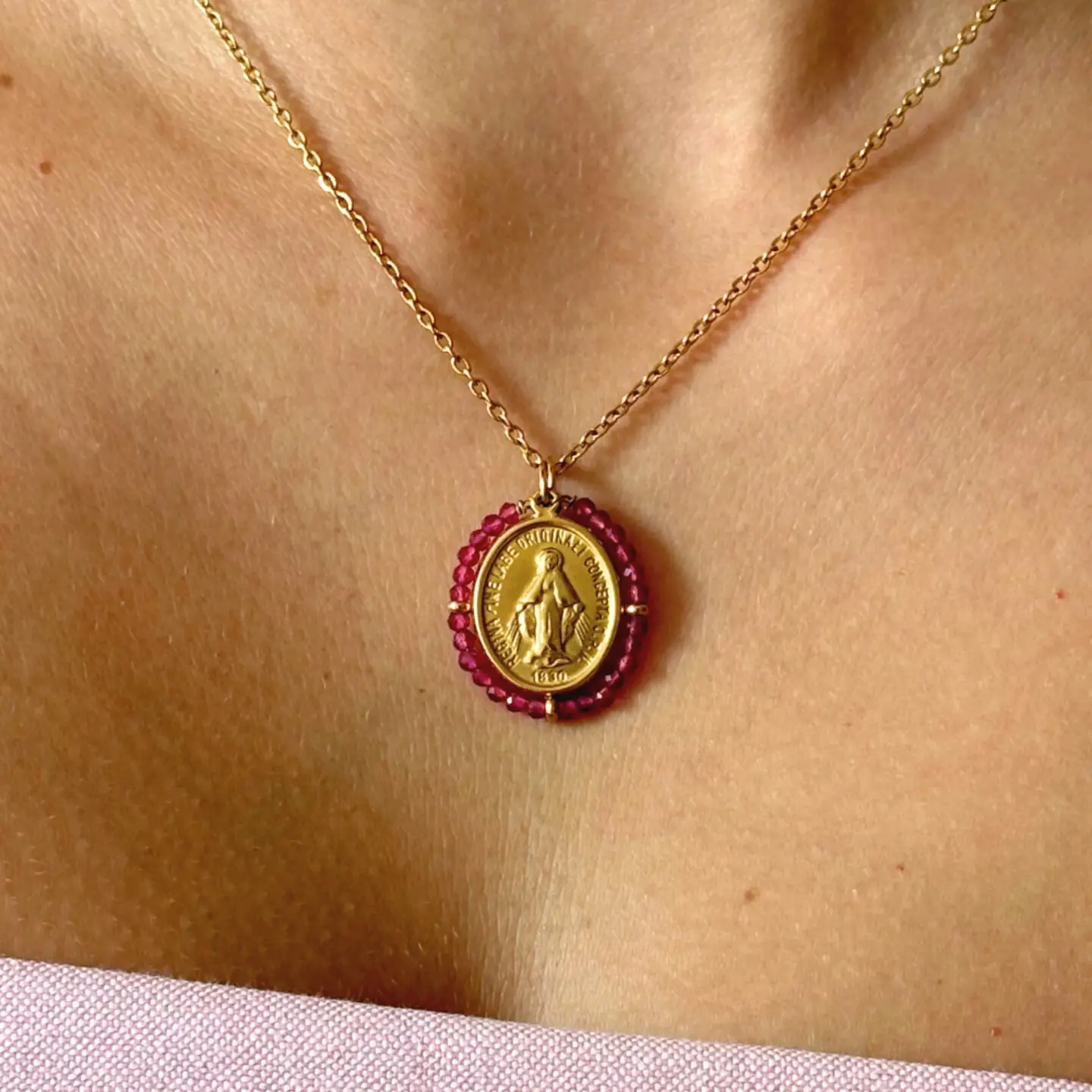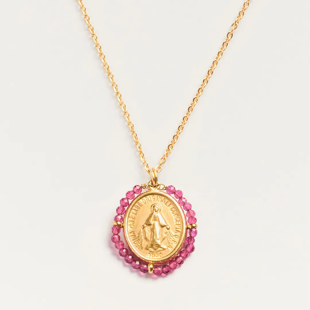 Ce collier élégant “Santa Maria Grenat” de chez PALAS, allie raffinement et modernité grâce à sa médaille dorée délicatement ornée de pierres violettes. Monté sur une chaîne fine, ce bijou hypoallergénique et non ternissant est conçu en acier inoxydable doré, garantissant durabilité et confort au quotidien. Son design sophistiqué mais facile à associer en fait un accessoire incontournable pour sublimer toutes vos tenues, du casual chic au look habillé. Un cadeau parfait ou un must-have intemporel pour enrichir votre collection de bijoux ! Retrouvez la marque PALAS chez Bonnie Bonnie !