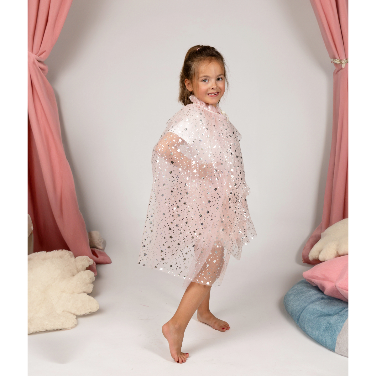 Ensemble tutu et cape Loane dans un doux rose poudré, parfait pour ajouter une touche de magie aux jeux et aux fêtes. Le tutu vaporeux associé à une cape élégante offre un look féérique et délicat que les petites princesses adorent.